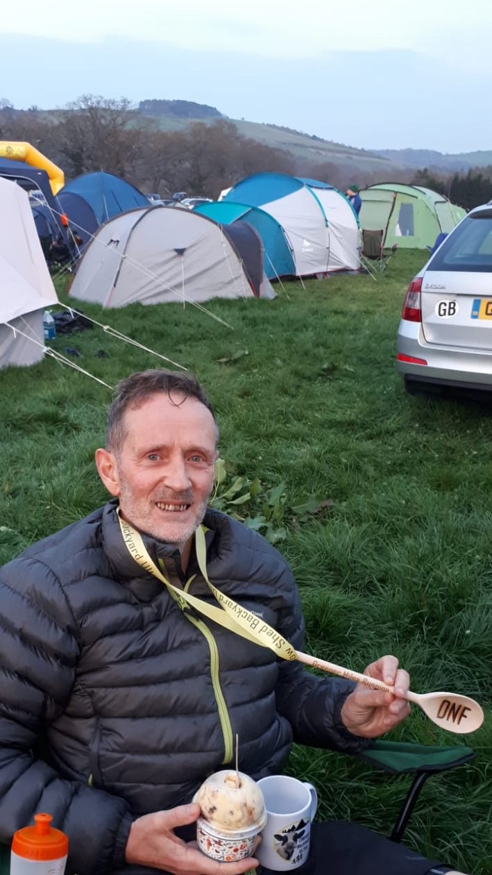I managed to complete the 8th round in 58 minutes. Maybe I could have done another or maybe have failed to complete in an hour. However at that point I could not envisage a 2 minute break and doing exactly the same as the previous hour. It was enough and joined the 33 others who ‘did not finish’ at that point. These 33.3 miles (53.3km) left me more ‘done in’ than in 26-30 hours of running a ‘normal’ long distance race. To complete the humbling psychology of the event I was duly awarded a wooden spoon. It was marked DNF (‘Did Not Finish’). Also given a ’Cow Shed Ultra’ mug. The double meaning of the mug was not lost on me either! Elisabeth reckons that if I start to regularly make soup the ‘DNF’ on the spoon will go away! Not sure the psychological scars will disappear so easily (only joking!).
