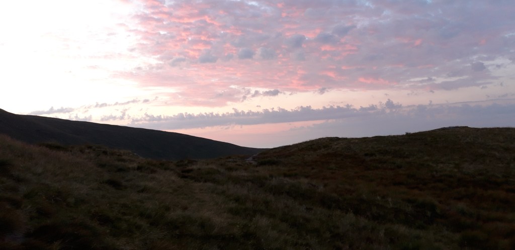 “It was a balmy night with the occasional light wind to cool things a bit. It was keeping the midges (small, biting insects) at bay. Lying in my bivouac I kept looking up at what looked like the Pleiades cluster of stars directly overhead my mosquito/ midge net. To the southern horizon on my left the near full moon shone its reflected glory. I felt the immensity of space and time above. This coupled with the sense of my fragile head resting on the ground evoked both wonder and smallness. It was an ‘awe-full’ time. Eventually got to sleep about 0100 I guess.”