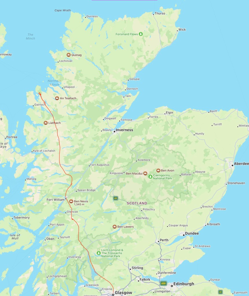 From 23 – 29/30 April 2023 I have set myself the challenge of doing an off road 7-8 day trail run/ fast hike from Glasgow to Aultbea, Wester Ross in the North West Highlands of Scotland. The idea has been in my mind for several years but have kept putting it out of my mind.